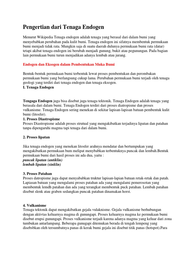 Bahkan, aktivitas manusia juga termasuk kedalam tenaga eksogen lho! Apakah tenaga endogen merupakan tenaga pembentuk muka bumi? Oleh karena itu, semua yang ada diatas permukaan bumi dapat dianggap sebagai sumber tenaga eksogen. Tenaga endogen adalah tenaga yang menyebabkan bentuk mukabumi tidak rata/berelief yang berasal dari dalam bumi. Contohnya adalah angin, air, matahari, dan aktivitas flora dan fauna.